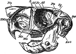 Fig. 1.—Skull of Jumping-Hare (Pedetes caffer). P Mx, premaxilla; Mx, maxilla; Ma, malar; Fr, frontal; L, lachrymal; Pa, parietal; Na, nasal; Sq, squamosal; Ty, tympanic; ExO, exoccipital; AS, alisphenoid; OS, orbito-sphenoid; Per, mastoid bulla. |