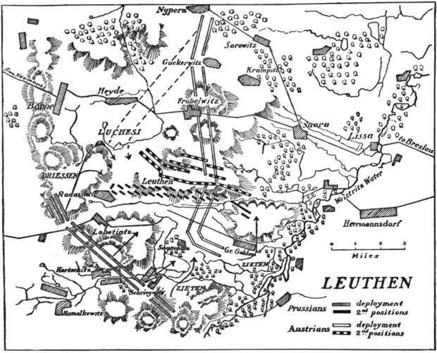 Bevern in Silesia, who had been beaten at Moys near Gorlitz (September 7th) and in the battle of Breslau on the 22nd of October, had been compelled to retire behind the Oder, leaving the fortresses of Schweidnitz and Breslau to their fate, and both had capitulated within a few days. Leaving a small reinforcement for Ferdinand, the king now moved by forced marches to Liegnitz. The distance, about 170 m. through difficult country, was covered again in 12 days, but the numbers were small, only 13,000, which shows how tremendous had been the drain upon the men of the previous six weeks’ exertions. On the night of the 4th of December, having joined the beaten forces of Bevern at Parschwitz, making in all 43,000 men of very unequal fighting value, he decided to attack the 72,000 Austrians who lay across the Breslau road, their centre marked by the village of Leuthen (q.v.). His position appeared so