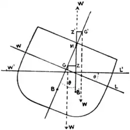 Let fig. 1 represent a transverse section of a ship, WL being its water line when upright, and W′L′ its water line when inclined to a small angle θ as shown.Transverse stability.