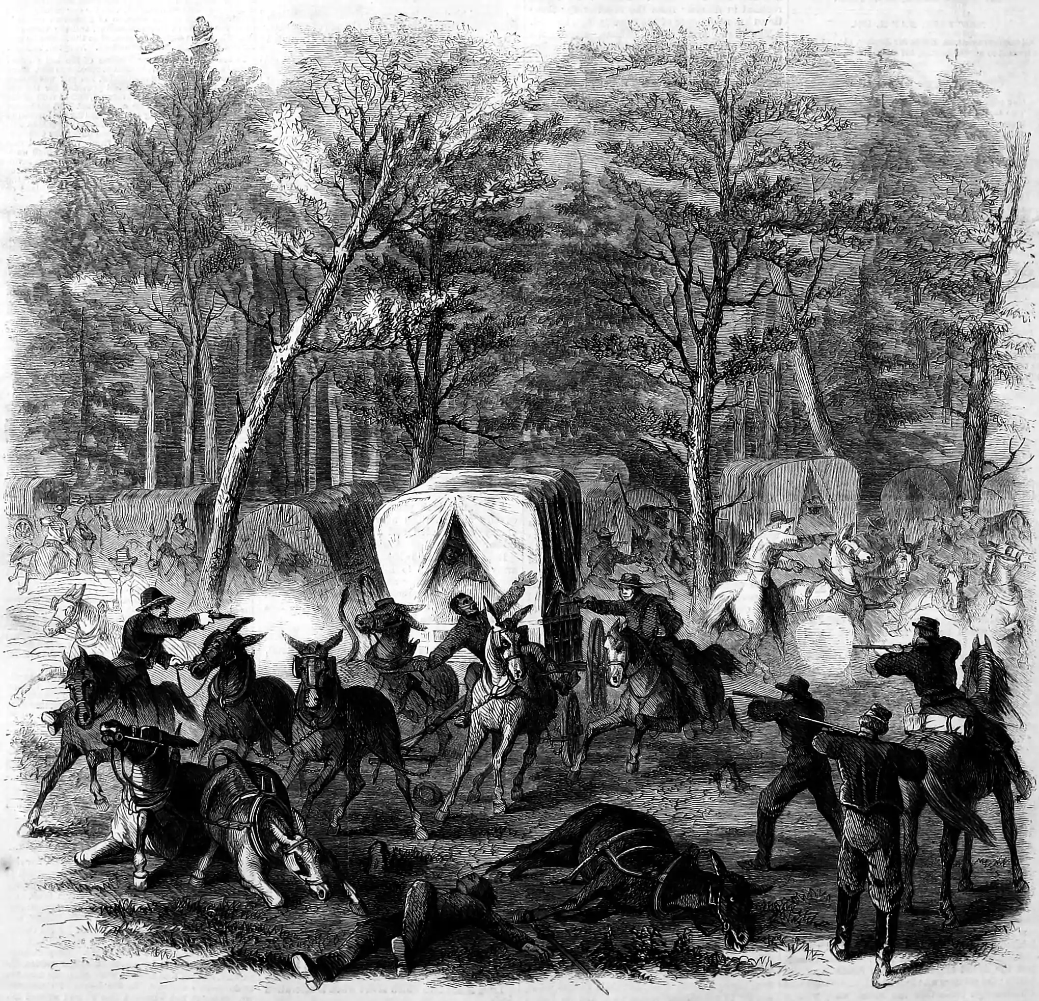 The attacking of a train is done systematically. In a narrow road like this one, running through a wood, it is merely necessary to kill the front horses or mules of a few wagons at the head of the line, and the whole are taken.