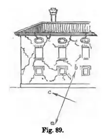 These figures apply to wall apertures of the usual moderate size of windows and doors. When very much larger and wider, and covered at top with plate-band arches or stone lintels, two or more fissures often take place, by the opposite movements of the first and second semivibration of the wave, and large fragments fall out.
