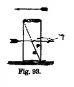 In order to upset the body, the horizontal velocity impressed by the shock (whatever be the duration of the latter) must be sufficient to make it turn upon one of the arris's or angles of its base, through an angle formed by the line, Fig. 93, joining the centre of gravity with that angle or arcis, and the vertical through it.