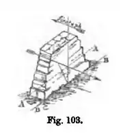 The fracturing force may be considered as applied at the centre of gravity of the mass detached; and the moment of cohesion at half the radius of oscillation of the plane of fracture, at the base, viewed as surface about to vibrate round the axis or , as a compound pendulum.[1]