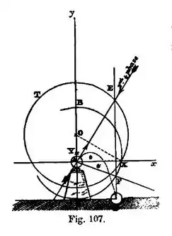 Let (Fig. 107) be the top of any tower or other elevation from which a body has been projected. From draw vertical and ( being the height due to the velocity, supposed given). Through draw horizontal. Bisect in , and on describe the semicircle . Bisect in , and with as centre and as radius