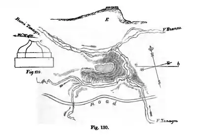 But I can see that the top of the cupola of the highest campanile or tower in the place, probably that of the church, has been broken off short and is gone, obviously by the direction of the fracture, by a force from the eastward and a little south, or about 70° W. of N. by estimation (c, Fig. 129), being, as figured, at the east end of the cupola, which was an hexagonal, Saracenic sort of small dome, of limestone, obviously modern.