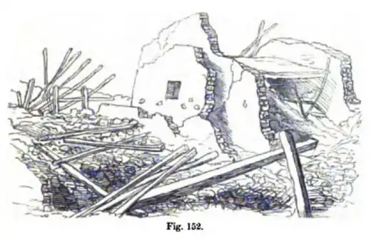 were universally down and in rubbish, unless something had accidentally propped them up. In the sketch No. 152, the gable wall a, had been built within about 2½ feet S. of b, a passage had probably run between them; b was kept up by flooring and other props to the northward, but a had swayed over at top to the northward, and leaned against b there, the bottom of both being buried in rubbish wherever the fracture had occurred.