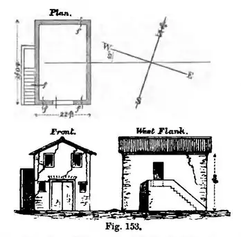 cardinal (axial line 10° W of N.), built of rubble, with cut stone jamb dressings, and middling quoin stones, and with a heavy external stone staircase on the west flank. It was fissured in several places, and the fractures gave a wave-path of 120° W. of N., and an emergence of about 65° with the horizon. The emergence might be steeper, however, the direction of the fissures in the front, had been coerced in some degree, by the large proportionate surface, of cut stone jamb dressings.