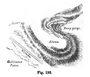 a fissure also exists in the earth, which Signor Jachetti affirms when first opened extended into the rock beneath, but that the rains have since filled the latter in. I have much doubt of the fact, however, from his description of the appearance of the rock at the alleged fissure, which rather seems to have been an ill-defined junction of bedding at a steep angle, and that the outer bed of rock had slipped a little downward and outwards, over and from that on which it reposed. The earth fissure, however, was traceable for several hundred yards beyond the saddleback of a colline, connecting the spur of Atena with the main range of lower hills behind. It appeared originally to have been about 2 or 212 inches wide, and one side had descended about 3 inches below its original position. It was in earth over the limestone, varying from 2 to 4 feet in depth—a manifest case, like that in the plain, of slippage and shaking off of loose material, and not of actual fracture by bending or dislocation (Fig. 193).