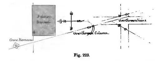 I found here also, as at Polla, an example of that singular circumstance, the keystone or block, of a cut stone semicircular arch over a doorway, which had worked up in place of coming down (by the movements of the earthquake) between the remaining arch stones. This case, of which the (original) Sketch No. 224 is a true representation, (though very imperfectly given by the woodcut,) is obviously due to the rocking to and fro of the whole wall in the plane of the arch, the motion being several times repeated, and hence the alternate partial freeing and gripping of the keystone, at and , and , between the rocking voussoirs, which, moving on the lowest point of the jambs, or at the springing level, are thus at each oscillation, relatively higher and lower than each other, at and at . The