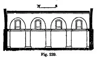 To the eastward of the front square, the roofs of the church, and of the grand refectory, groined and arched buildings of great magnitude, have been heavily fissured. In the refectory both end gables, (Fig. 239,) run up originally against the ends of the brick vault, have parted off from it, and