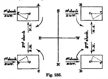 semiphase A, and second semiphase B, by the same double shock; secondly, the like by rotation, in the first semiphase (C), the first shock being as before, but the second, contrary in direction to that of the previous cases (A and B), and the like for the second semiphase (D), the two shocks being the same (C and D).
