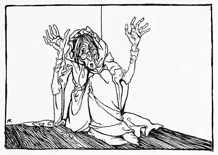 But they were not alone, although they thought they were. The hag that guarded the jewels was in the room. She sat hunched up against the wall, and as she looked like a bundle of rags they did not notice her. She began to speak then.