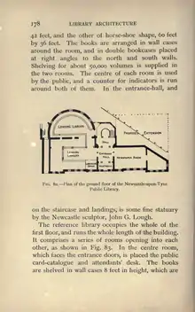 42 feet, and the other of horse-shoe shape, 60 feet by 36 feet. The books are arranged in wall cases around the room, and in double bookcases placed at right angles to the north and south walls. Shelving for about 50,000 volumes is supplied in the two rooms. The centre of each room is used by the public, and a counter for indicators is run around both of them. In the entrance-hall, and