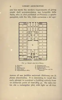 any way meets the modern requirements of giving ample shelf accommodation was Leopoldo della Santa, who in 1816 published at Florence a quarto pamphlet, with the title Della costruzione e del rego-