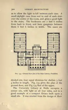 <!-Fig. 133. Ground floor plan of the State Library, Frankfurt.--> divided into four equal divisions for shelves 3 feet 4 inches in length. Fig. 133 gives the plan of the ground floor, and Fig 134 that of the upper.