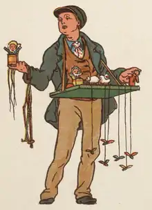 Bawling out his toyman's song,