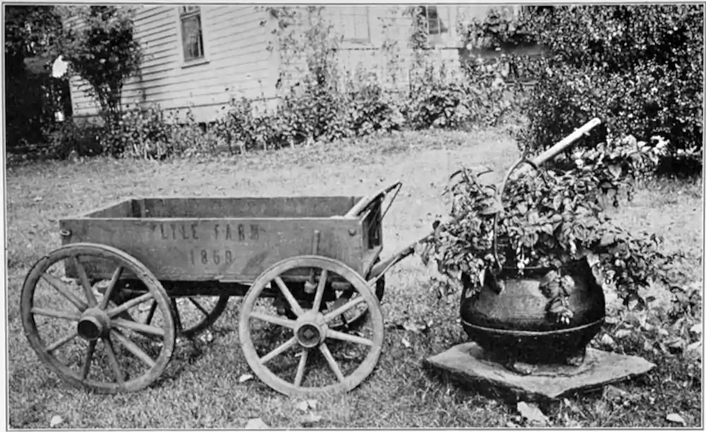 Little wagon which John Lyle had made for his children in 1858. In payment he gave a cow. The stone is a part of doorstep of the log cabin. The iron kettle was used in housekeeping.