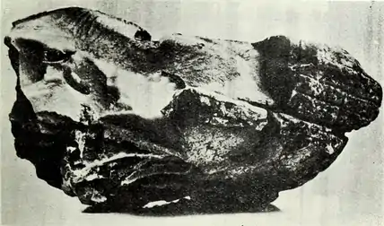 Large cake of Nehalem wax, showing engraved character. This cake, when whole, measured about 20 × 6 × 16 inches. Portland City Museum.
