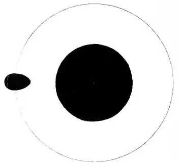 shape, not only by diurnal motion, but by the more potent influence arising from the attraction of a great central orb, similar results may be obtained, but they admit of a more obvious explanation. The accompanying figure will give an idea of the manner in which, in such dangerous ground, a secondary planet would be affected, especially if it were composed of homogeneous and very yielding materials. If the two bodies were as disproportionate in size as Jupiter and his nearest moon, stability would be impossible on the minor one as soon as gravity
