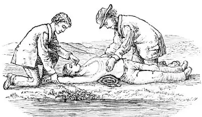gradually increased from four to fifteen times in a minute, and with the regularity observable in the natural motions of breathing which are thus imitated. If natural breathing is not restored in three or four minutes, the patient is turned a second time upon the stomach in an opposite direction from that in which he was first turned, the object being to free the air-passages from any remaining water. The artificial