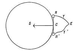 Let S of the diagram be the source of a sound, and let the circle represent a wave-surface produced by that sound. On this surface all the molecules of air have, at the same instant, the same direction and the same velocity of vibratory motion. If we can accurately determine two points, R and R', on this wave-surface, and this wave-surface be a spherical one, that is, be not deformed, then a perpendicular, S, erected to the center of a chord drawn between these two points, will, when produced, pass through the source, S. The method consists in determining these two points on a sonorous wave-surface, as follows: