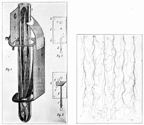 | Fig. 7. Leeuwenhoek's Microscope. | Fig. 8. Capillary Circulation, after Leeuwenhoek. | |