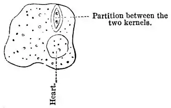 the body! The toad sometimes swallows its old skin, but the amœba is the only animal I know which is "taken in" by its feet! How odd it would be, if, as you walk along, you should suddenly disappear into your boots! If you crush the amœba, you find no trace of a tough sac such as you found in the yeast and protococcus cells. You can see nothing but the kernel or nucleus, and even that soon disappears. If you stain with magenta or iodine, the whole cell becomes colored alike. If there were a tough, woody sac, as in the yeast and mould, it would not be stained. The iodine does not give it a blue color, so there cannot be any starch in the amœbæ. The amœbæ grow like the green-mould cells, by fission, that is, by one or two partitions made through the old cells. You will first see two kernels appear in one of the old cells; then, by close watching, you see a partition going right down between the kernels, separating the old cell into two, with a kernel or