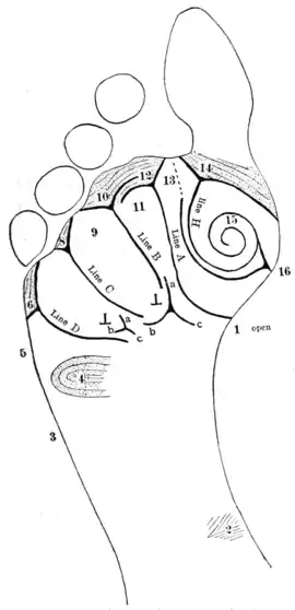 These difficulties, especially that of the extra-limital position of the digital triradii, certainly prove a barrier towards the application of the same system as in the palm; yet, with some adjustment to conditions, this would still seem to be feasible. A diagram assigning numerical designations to the