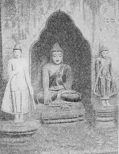Fig. 78. Shrine at Amarapura. economic importance, with an exceedingly useful silk-weaving institute and with many carvers of images. Here used to be the kheddah, the enclosure into which wild elephants were enticed in the king's time and in our early years. Here are many famous pagodas; the Shwegyetyet group, 600 years old; Patodawgyi, a very large and beautiful pagoda decorated with glazed tiles, the work of King Bagyidaw in 1818; and Kyauktawgyi built by Pagan Min in 1847 on the model of the Ananda at Pagan, its porches adorned with frescoes.