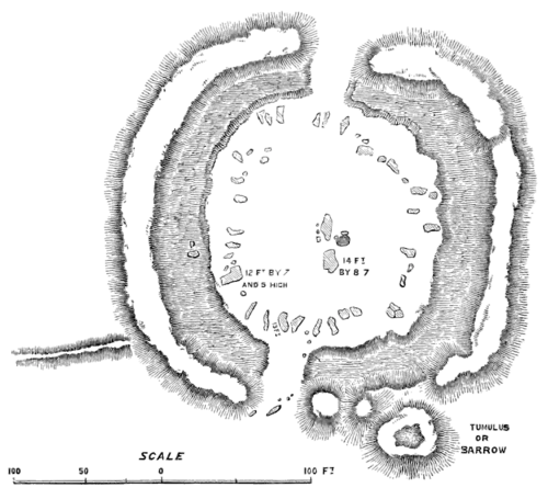 The Derbyshire example, however, possesses, in addition to its earthworks, a circle of stones on its inner platform, originally probably forty or fifty in number; but all now prostrate, except perhaps some of the smallest, which, being nearly cubical, may still be in situ. In the centre of the platform, also, are several very large stones, which evidently formed part of a central dolmen.