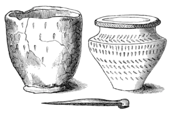 summit. The whole fell down, and the stones composing the cist were removed and re-erected in the garden of Lumberdale House. It consisted of four massive blocks of limestone forming the sides of a chamber, 2 feet by 2 feet 6 inches, and covered by one 4 feet square. The cap stone was not more than 18 inches below the turf. By the sudden fall of the side a very pretty vase was crushed, the