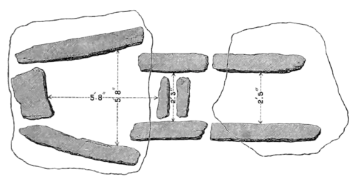 at the top in 1786 there stood five kistvaens, each capable of containiug one body; and, so far as can be made out from Douglas' plates and descriptions, the cap stone of these was flush with the surface, or possibly, as at Gib Hill, they may have been a few inches below the surface, and, becoming exposed, may have been rifled as they were found; but this is hardly probable, because unless always exposed, it is not likely they would have been either looked for in such a situation, or found by accident. Below them—at what depth we are not told—a stone chamber, or rather three chambers, were found by Mr. Bateman, apparently on the level of