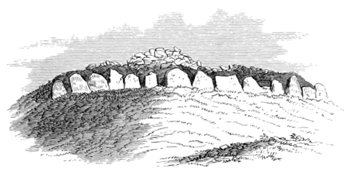 "The battle took place on Midsummer day. The Firbolgs were defeated with great slaughter, and their king, who left the battle- field with a body-guard of 100 brave men in search of water to allay his burning thirst, was followed by a party of 160 men, led by the three sons of Nemedh, who pursued him all the way to the strand, called Traigh Eothaile, near Ballysadare, in the county of Sligo. Here a fierce combat ensued, and King Eochy (Eochaidh) fell, as well as the leaders on the other side, the three sons of Nemedh."[1] A cairn is still pointed out on a promontory jutting into the bay, about a mile north-west of the village of Ballysadare, which is said to have been erected over the remains of the king, and bones are also said to have been found between high and low water on the strand beneath, supposed to be those of the combatants who fell in the final struggle. It
