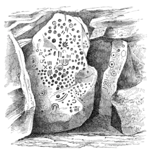 ments fully bears out this view. The carvings at Lough Crew are ruder and less artistic than those at Brugh. They are more disconnected, and oftener mere cup markings. The three stones represented in the preceding and following woodcuts (Nos. 75 and 76), are selected from a great many in the Conwell portfolios as fair average specimens of the style of sculpture common at Lough Crew, and with the woodcut No. 73, representing the Hag's Chair, and No. 75, the chamber in cairn L, will convey a fair notion of the whole.