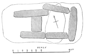 The cell is well formed, but in front of it is a demi-cell, or ante-chamber, which looks as if it might have been used for making offerings to the dead after the cell was closed. One other dolmen deserves being illustrated before going further, as it belongs to a class of monuments common in Brittany, hitherto unknown in Great Britain. It consists of a cell 12 feet 8 inches long internally, with a width of 4 feet at the entrance, but diminishing to 3 feet at its inner end.