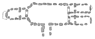 It stands in the deer park of the Hazlewood domain, about four miles east of Sligo. It is entered from the south, and consists first of an enclosure 54 feet by 24 feet. To the westward of this is a smaller apartment, about 30 foot by 12 feet, divided into two by two projecting stones. At the east end are two similar apartments side by side, but smaller, the whole length of the structure measuring about 115 feet.[1] The three entrances from the central to the side apartments are trilithons of squared and partially dressed stones, and would remind us of Stonehenge, were they not so small. They are only 3 feet under the lintel, and you must bow low indeed to pass under them. Indeed, when speaking of these enclosures as apartments, it must be borne in mind that one can enter anywhere by passing between the stones, and stepping over the walls, which are composed of stones hardly ever touching each other, the highest being only 3 or