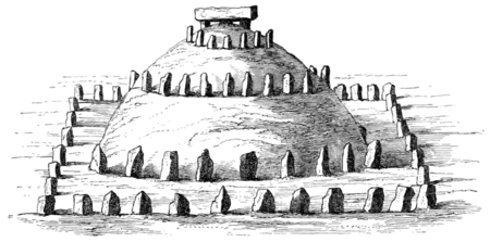 Among these peculiarities, the most easily recognised are the square or oblong enclosures which surround tumuli, and, sometimes, one, at others two, or even three free-standing dolmens. In order to make the point clear, I have quoted a diagram from Sjöborg, though it is almost the only instance in this work in which a woodcut does not represent a really existing object. I have no doubt, however, that it is correct, as old Olaus Wormius represents one of two similar ones which in his day existed near Roeskilde. Both had enclosures 50 paces square, enclosing one tumulus with a circle of stones round its base, another halfway up, and, the text says, an altar-dolmen on the top, though the woodcut does not show it. The other, on the road to Birck, in Zeeland, enclosed three tumuli in juxtaposition, the one in the centre similar to that just described, and with a dolmen on its summit; two smaller mounds are represented in juxtaposition on either side, but with only a circle of stones round their base.[1] Other varieties