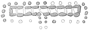The annexed attempted restoration of one near Emmen will give a fair idea of their general arrangements. It is 49 feet long over all, and internally from 4 to 6 feet in width. It is roofed with nine or ten stones, some of considerable dimensions. Some of these Hunebeds have a range of stones round them, not arranged in a circle or oval form, but, as in this instance, following the lines of the central chamber. This is the case with another near the same place, which is 125 feet in length over all. When closely examined, however, it does not seem to be one Hunebed, but three ranging in a straight line, with a small space between each. Two have five and one six cap stones. As a rule, each cap stone stands on two uprights, and though frequently they touch one another, as often they form really independent trilithons. It was no doubt this fact that induced Keysler to compare these monuments with Stonehenge, though in fact no two sets of rude-stone monuments could well be more dis-