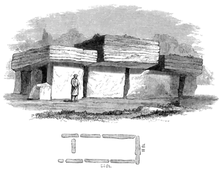 The more usual form of French dolmens is either square or slightly in excess of that form, seldom reaching two squares in plan, and with a height equal to its breadth. One of the finest specimens[1] of a monument of this class is in the middle of the