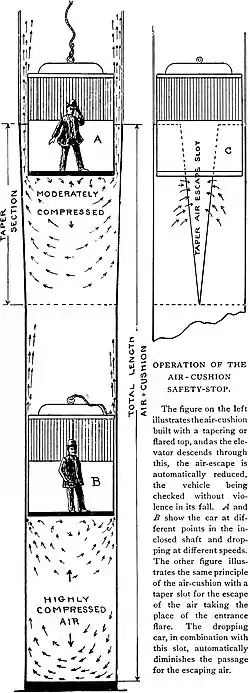 “By an air-cushion, I mean,” he continued in answer to our question, “a scheme for retarding the car in case it should fall by any mischance. The bottom of each shaft is sealed in with air-tight steel doors, so as to make a rectangular pocket in which the car fits like a plunger in a cylinder. Now, if the car should drop into that pocket at high speed, it would compress the air under it Lo such an extent as to form a pneumatic cushion that would check its fall. Our highest elevator-shaft will be six hundred and eighty feet high, the highest continuous elevator-shaft in the world, and, as you can imagine, a car would be traveling if it fell that far! We don’t dare to make the stop too abrupt, for it would hurt the passengers, and then, too, it would be liable to burst out the doors, so we don’t make too close a fit of the car floor in the shaft. But that means that we have to extend the air pocket to a considerable height. On those high shafts, the air pocket extends up one hundred and thirty-seven feet, or ten stories. You could cut the cables with the car at the top of the shaft and let it fall. It would be making something like one hundred and thirty-two miles per hour when it823