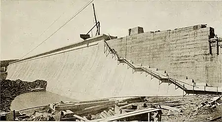THE DOWN-STREAM FACE OF THE MASONRY PORTION OF THE OLIVE BRIDGE DAM.