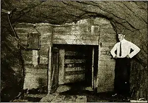 THE DOORWAY LEADING INTO THE DYNAMITE MAGAZINE. pound of dynamite? But here is the difference, gasolene combustion is comparatively slow, while the chief value of dynamite is the suddenness of its explosion. It is chiefly that first explosion wave that we must guard against, and so we make it dash itself against the rock walls until it is pretty well spent. This door here” (we had come to the end of the passageway by this time), “is made to stand twice the pressure that we estimate it will be subjected to. See, it is built of heavy steel I-beams, with oak timbers twelve inches square between them; and then the door-way is set in an enormous mass of concrete, Oh, no, it could not possibly give way.”