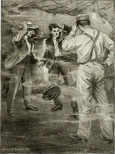 “That is the beauty of this magazine,” laughed the superintendent, picking up the dirty, bedrageled cap and handing it to Will. “If you had been out in the tunnel, your cap would have sailed off, Heaven knows where, and it might have taken you all day to find it. But here in the magazine it is sure to come back on the return wave. Even though it may be a bit dirty, you will always get your head-gear back again. But we ’d better get out of this before the smoke gets too thick,” Already the smell of the fumes was quite noticeable, as they were being driven out by the air that was being pumped to the heading,