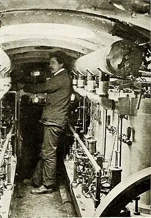 At the forward end of the baat, there were four torpedo-tubes, twa of which could be manipulated at a time, Our guide explained that the torpedoes would he placed in the tubes, the breech-blocks closed, and then the cap at the outside opened. The nose of the boat formed the cap. Dy turning a hand-wheel, the cap would be moved out a trifle, letting the water run into the tubes around the torpedoes, and then the cap would he turned on its axis so as to bring two holes in it into register with two of the torpedo-tubes, There was a plate inside which would indicate when the proper registry had been obtained.