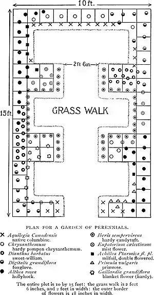The little plants from the seed-bed will he large enough to transplant into their permanent places by the middle of the month, so, of course, the permanent places must be made ready for them at once. If you are going to make a garden entirely of perennials, and are beginning it anew and apart from the summer garden or border of annuals, here is a little plan which you may like to follow. You will find it much easier to decide where each thing shall go by making a map of the garden first, and planting cach thing on paper. This you can take out of doors afterward, and transfer the plan to the ground very easily, if you will get some one to measure for you two strips of wood about three feet long—or perhaps you can do it for yourself. A common yardstick will be just the thing for one, of course; if you have this, take another strip, equally light and easily handled, if possible, and cut it to the yard length, marking it off into three equal parts of one foot each.