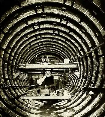 INSIDE THE TUNNEL SHOWING THE “ERECTOR,” BACK OF THE HORIZONTAL PLATFORM, RAISING A LINING PLATE TO POSITION.