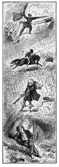 And at the zenith of his fame, how he would suddenly appear at the old village and stalk into church, brown and weather-beaten, in his black velvet doublet and trunks, his great jack-boots, his crimson sash, his belt bristling with horse-pistols, his crime-rusted cutlass at his side, his slouch hat with waving plumes, his black flag unfurled, with the skull and cross-bones on it, and hear with swelling ecstasy the whisperings, "It's Tom Sawyer the Pirate!—the Black Avenger of the Spanish Main!"