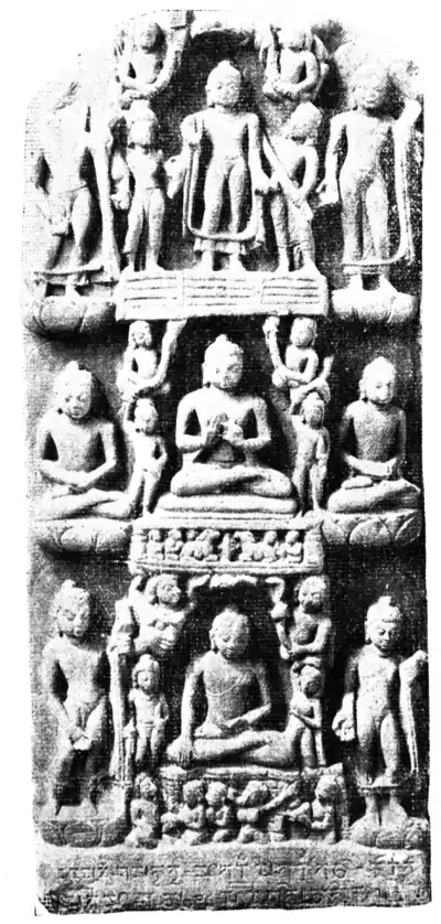 (1) Devavatara, (2) Dharma-cakra-pravartana and (3) Sambodhi, Stele from Sarnath, Benares, dedicated by the Buddhist Monk Harigupta. (Indian Museum, Calcutta.)