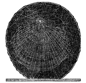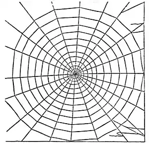 web, out of which all intruders were kept. And now it was found that all these webs were inclined at nearly the same angle, and were never exactly vertical; that, like the spider in the first web she made in the Botanical Garden, the insect took a position much nearer the upper than the lower border; and also that, instead of a web of perfect circles laid upon regular radii, as used to be described and is still figured in our books, or even one of a spiral line, as is now more correctly described of ordinary geometrical spiders (Fig. 6), these never made a circle, nor even a spiral, but a series of concentric loops or arcs of circles, the lines turning back upon themselves before reaching a point over the spider, and leaving the larger portion of the web below her; and more than this, that the lines, though quite regular, were by no means perfectly so, as may be seen in Fig. 7, copied from a photograph.
