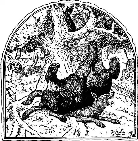 The wild boar got up in a dreadful fright, gave one loud grunt and disappeared into the wood. But the cat was even more startled than the boar, and, spitting with terror, she scrambled up into the fork of the tree, and as it happened right into the bear’s face. Now it was the bear’s turn to be alarmed, and with a mighty growl he jumped down from the oak and fell right on the top of the wolf and killed him as dead as a stone.